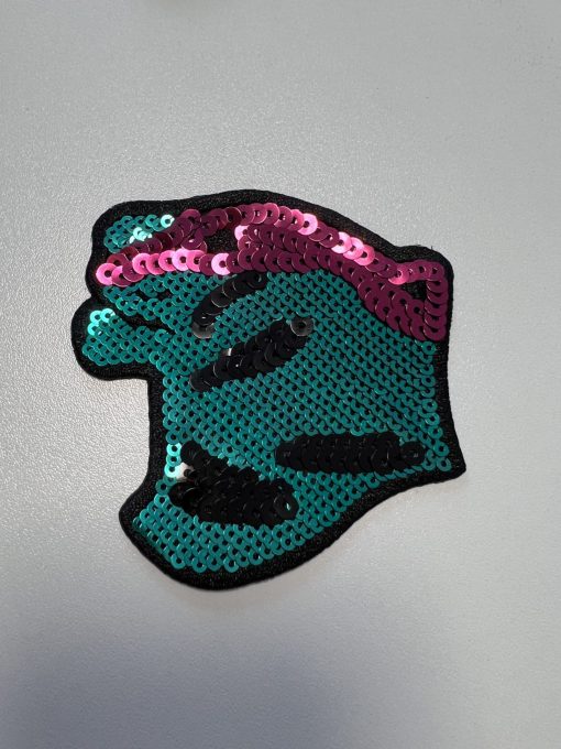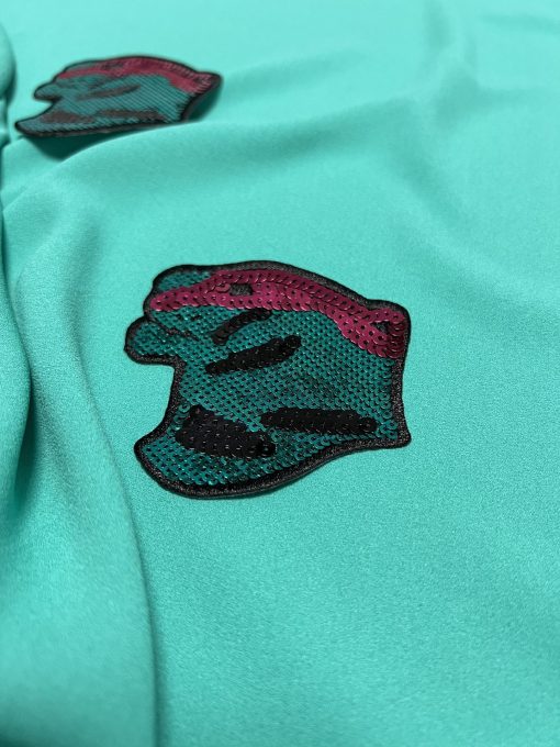 Originální flitrová aplikace je nádherný designový doplněk na širokou škálu oděvů. Aplikace ve velikosti 8 x 8 cm byla navržena pro limitovanou kolekci hedvábných látek pro italský módní dům Escada, v barevné kombinaci růžové a tyrkysové. Originální aplikace s uměleckou fantazijní siluetou hlavy lvice tak zcela jistě povýší váš šicí projekt na vyšší úroveň:). Designéři navrhli tuto speciální kolekci flitrových nášivek/nažehlovaček speciálně ke dvojici hedvábných krepžoržetů, růžovému a tyrkysovému, které máme také v naší nabídce. Je na vás, jestli tuto aplikaci na látku našijete a nebo nažehlíte. Aplikaci si můžete pořídit i samostatně a ozdobit s ní jakýkoli kousek oblečení ve vašem šatníku – třeba i obyčejné tričko! Mrkněte i na video vedle fotek.