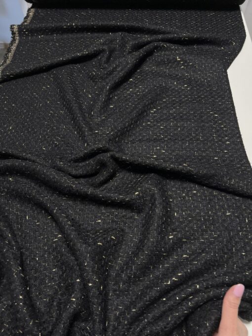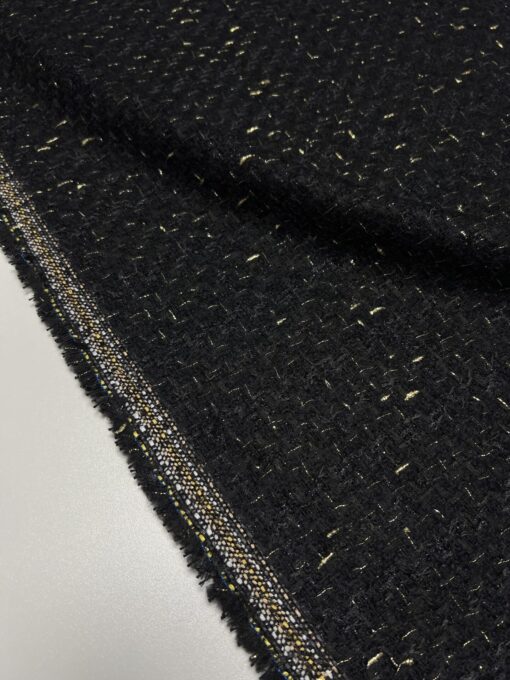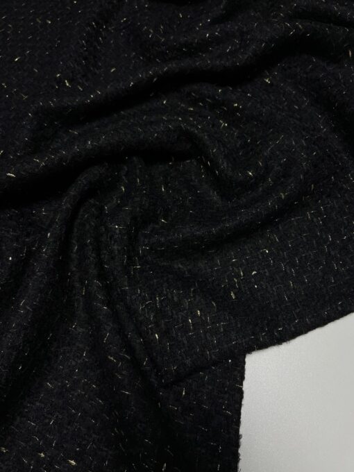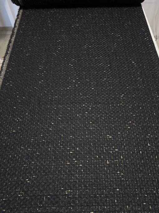 Buklé v černé barvě se zlatou vetkanou lurexovou nití je exkluzivní vlněný tvíd s kašmírem, v šířce 148 a gr. 450 gr/m, ve složení (30 % WV, 20 % WM, 10 % WS, 30 % CO a 10 % Lx). Náš tvíd byl vyroben pro věhlasný francouzský módní dům CHANEL a je ideální na kostýmky, sukně nebo na ikonické kabátky nebo kostýmky a la CHANEL. Nádherná látka je velmi působivá už na první dojem svou vytkávanou strukturou, lurexovým vláknem a je zároveň velmi elegantní a nadčasová. Buklé je hebké, měkoučké, dobře drží tvar a nemačká se. Tento designový materiál v prémiové kvalitě s vysokým podílem kvalitní vlny a vzácného kašmíru zaručuje komfort a velmi příjemné nošení. Tuto nádhernou netradiční a na našem trhu zcela ojedinělou textilní látku vám vřele doporučujeme. Mrkněte i na video vedle fotek.