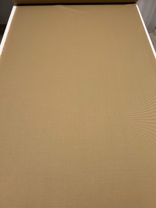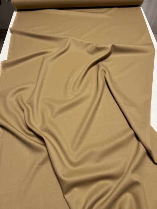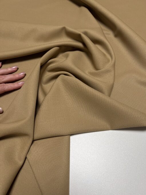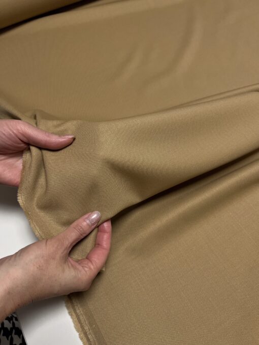 Kostýmovka BOSS v barvě velbloudí srsti s elastanem je v šířce 150 cm a gr. 420 gr/m, je exkluzivní převážně vlněný tvil (60 % WV, 38 PL a 2 % EL). Krásná a elegantní látka byla vyrobena je pro italský módní dům BOSS. Naše kostýmovka je měkká, poddajná, nemačká se, nekouše a má přirozený vlněný perlový lesk. Skvěle se hodí na celoroční pánské i dámské elegantní kostýmy, saka, kalhoty, šaty, vesty, bombery, lehčí kabátky a sukně. Velmi dobře z této látky šije. Mrkněte i na video vedle fotek.